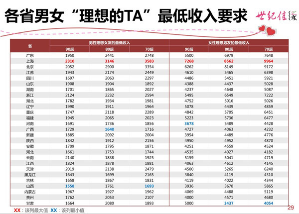 近日,由世纪佳缘网站发起的《2012-2013中国男女婚恋观》调查报告甫一发表,就引起了公众的关注和热议。其中讨论最为热烈的要数各地男女对于理想对方最低收入的要求,也被网友戏称为“恋爱起步价”,有网友表示,这份爱实在是太“贵”了,让人“爱不起”。所谓的“恋爱起步价”,并非此报告原创,早在去年夏天由民政部中国社会工作协会婚介行业委员会与百合网联合发步的《2011中国人婚恋状况调查报告》就显示,近80%的受访单身女性认为,男性月收入4000元以上才配谈恋爱。