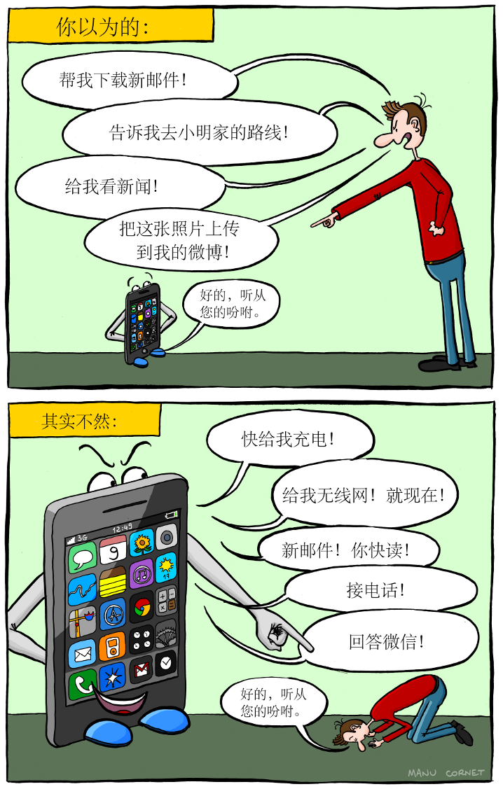 前几天看见一幅漫画写得很有意思,我们觉得手机很有用,命令它: