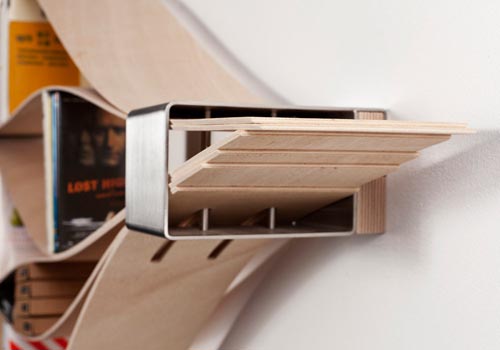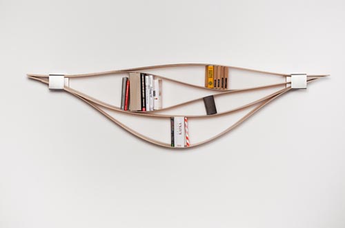 德国设计师Natascha Harra-Frischkorn设计的木条书架Chuck,舍去传统书架的方正外型, 将6块薄木板以吊床的方式左右固定在不锈钢架上,你可以随意调节弯曲它来摆出各种曲线造型, 用于陈列书籍或其他小玩意儿。