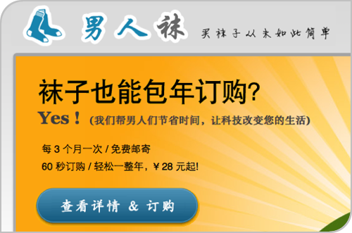 “男人袜”用极其简单的步骤满足了这帮懒惰的人的需求。这个网站甚至不用注册,直接使用支付宝支付一年的袜子费用,然后每三个月收到三双袜子。这样就非常完美的解决了“穿洞袜”的问题,中间的过程也极其简单。人类懒惰的本性让不懒惰的人找到了商业契机。