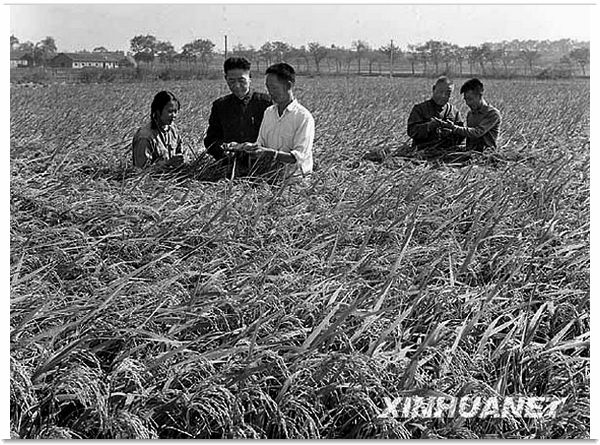 【1973年,袁隆平培育经过 9 年的艰苦努力,终于能够大面积实地栽培杂交水稻品种。他在 1981 年被授予新中国建国以来第一个国家特等发明奖,在国际上被称为“杂交水稻之父”。 图为 1975 年 11 月袁隆平院士(右三)与同事李必湖(右一)观察水稻是生长态势(图片:新华网)】