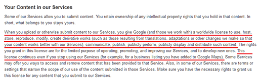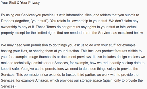 下面来看看很多人都在使用的 Google Drive 的用户协议里面又提及了哪些让人大跌眼镜的条款。图中划红线的部分是 Google 在用户上传资料方面做出的一个规定,大概意思是这样的:当你上传内容时,你将在全球范围内授权 Google 使用、主持、销售、再造、修改文件(例如翻译、适应以及修改成有益于我们的服务)、沟通、出版、展示以及分发。后面的一句话提到:即使你不再使用我们的服务,这个协议仍然有效。看到这样的协议不知道有没有用户会有膝盖中了一箭的感觉,虽然 Google 也提到了文件的拥有权使用为你保留,但你已经授权 Google 在全球范围内使用你上传的文件以及资料了……事实上类似的条款曾经也出现在 Dropbox 的用户协议中,但当时遭到了大量用户的诟病,最终 Dropbox 修改了用户协议中的相关条款,下图是 Dropbox 修改后的用户协议的一部分: