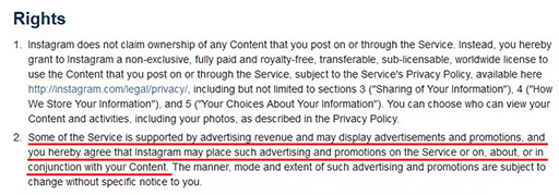 上图是 Instagram 声称迫于 Facebook 压力而修改后的用户协议,协议中的一条内容激怒了 Instagram 的用户。用户协议规定“部分或全部服务将由广告服务来支持”,意思就是说“企业或其他组织使用您的照片用于各种推广业务时,需要向我们付费,但您不会获得任何补偿”。阅读了协议之后,发现的确有设计到这条的内容。这样的协议意味着用户在 Instagram 上传的照片可被用于广告服务,而广告中不需要提及到上传照片的用户,甚至也没有义务通知用户自己的照片被用于相关的广告服务,因为在用户成功注册之时,已经同意了这样的一个条款。而使用用户图片的广告获得的全部收益将归 Instagram 所有,与用户毫无关系。直到用户选择停止这项服务并删除全部照片,Instagram 都可以不断利用用户的图片赚钱。想象一下你上传的图片在不知不觉中为服务商赚的盆满钵满,而你自己有可能浑然不知。