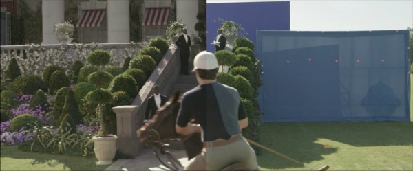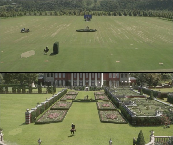 其实,他们能找到这样一片平整干净的草坪已经不容易了,上图那块孤零零的方形草垛就是方便特效公司后期校准透视的,最中间那块渺小的蓝布前的阶梯有点搞笑,但这里需要站个演员,置景部门这块蓝布是怎么都没法再省了,中间的花坛也是一样道理,因为和人碰上了,没办法,搭一个吧