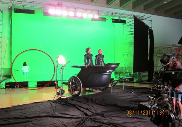 看到最右侧的绿布都快被呲成黄色,影魔乱舞的绿背了吗?后期部门又要掀桌了,不过这次也为难置景了,因为导演要一个镜头完成,特效棚不够大了