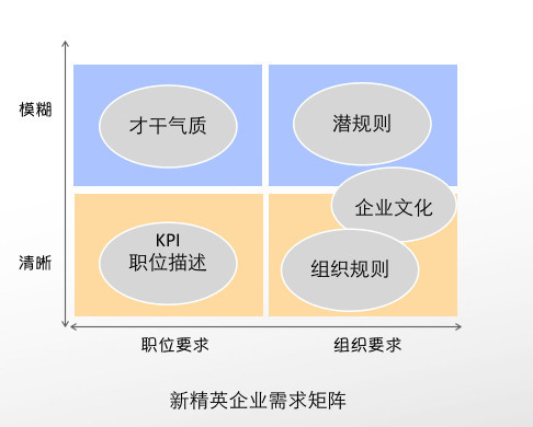 我尝试来打开这个黑盒子:如果你把纵轴作为“清晰-潜在”,横轴作为“对个人行为的要求——对组织行为的要求”,那么你能得到一个四象限的企业需求矩阵。